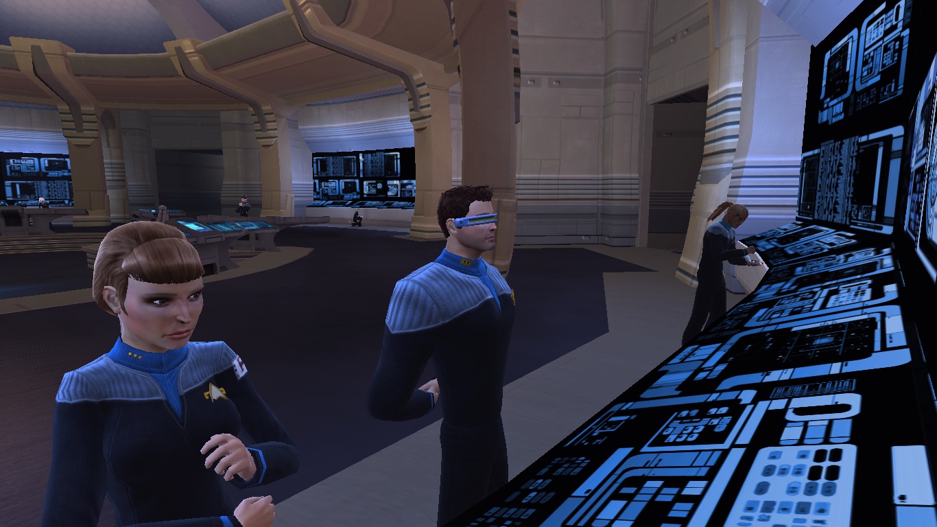 All of my Bridge Officers (BOs) are dressed for the current Feature Episode Series called "The 2800". For Trekkies in the room, yes, the Dominion are back. Funky stuff happened with the Wormhole. There's lots of fighting. Bajor is the current outpost. Good stuff. My toon (and his entire BO compliment of 12) is dressed up for the occasion in Deep Space 9-esque attire. It's awesome.